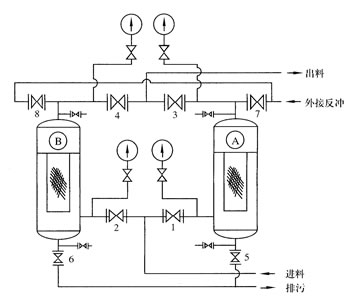 | 5. 雙桶自動(手動)反沖洗精細(xì)過濾器 (1)適用范圍:連續(xù)運(yùn)行的工況 (2)控制形式:設(shè)置手動,PLC程控和計(jì)算機(jī)閉環(huán)控制三種形式。 (3)性能特點(diǎn):濾材穩(wěn)定可靠、控制靈活多變、多罐并聯(lián)、連續(xù)運(yùn)行、反洗率高、操作方便。 (4)基本結(jié)構(gòu)形式如圖33,也可特殊設(shè)計(jì)和制造。 |